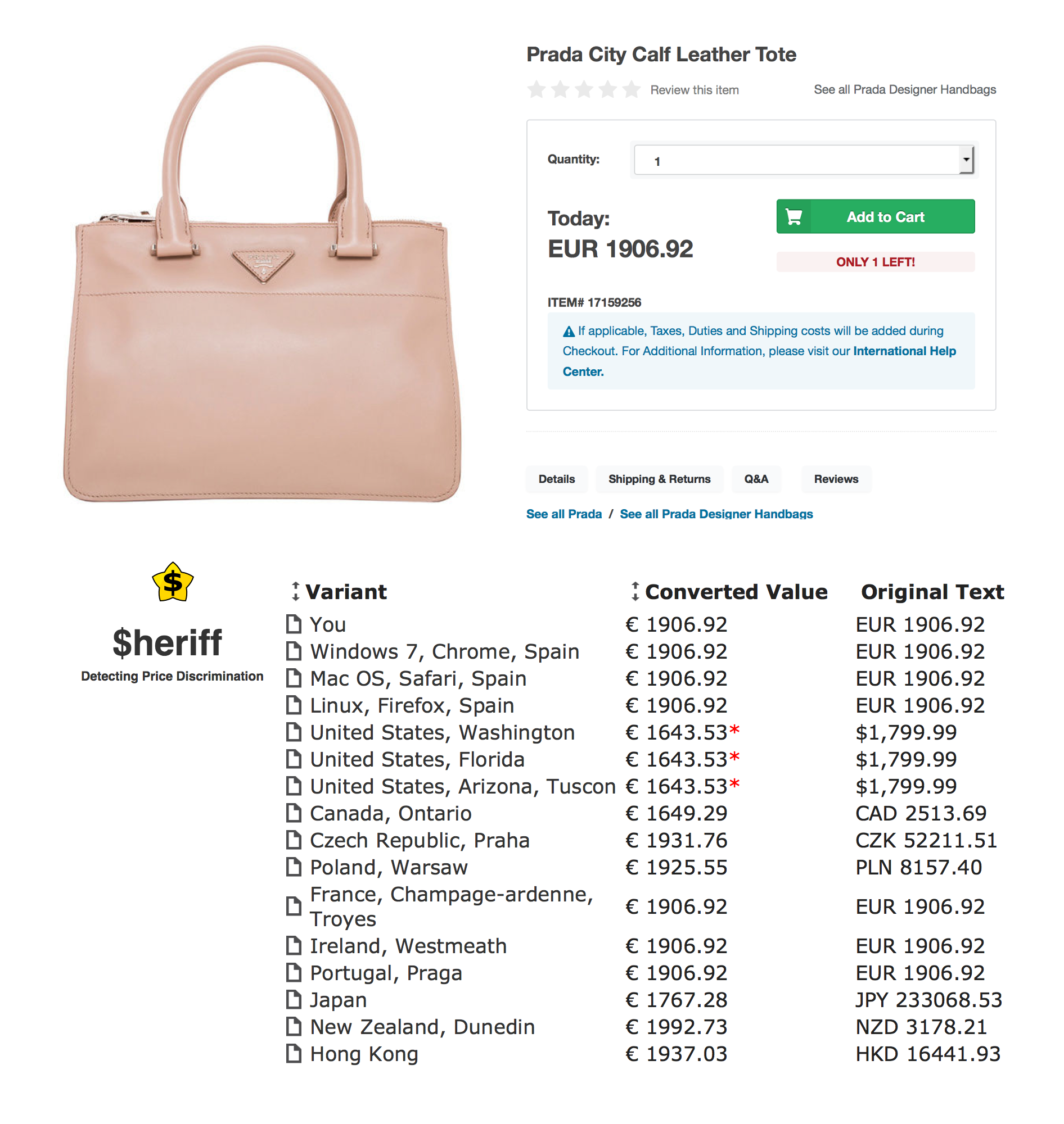 There are proven examples when companies tried to benefit from this illusion of their visitors – and below you can see two examples illustrating this. On the left, you can see online stores who used differentiated pricing, like for example, Amazon offered different prices based on the regions of their potential customers (source). On the right, a real example is provided by using a price-discrimination busting service, the Sheriff tool.
