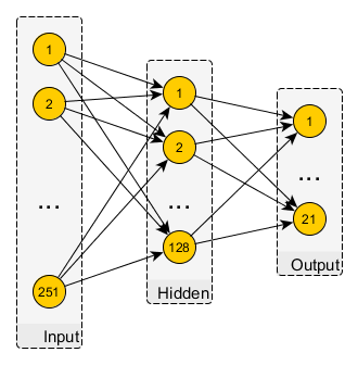 The current setting is the same described in the previous post: node neighborhood-degree fingerprints are used to predict how likely it is that they would be re-identified by the state-of-the-art attack. As I've seen examples using raw image data for character classification (as for the MNIST dataset) with a Multi-Layer Perceptron structure, I decided to use a simple, fully connected MLP network, where the whole node-fingerprint is fed to the net. Thus the network is constructed of an input layer 251 neurons (with rectified linear unit activation, or relu in short), a hidden layer of 128 neurons (with relu). To achieve classification, I used 21 output neurons to cover all possible score cases in range of -10, ..., 10. Here, I used a softmax layer, as an output like a distribution is easier to handle for classification. See the image below for a visual recap.