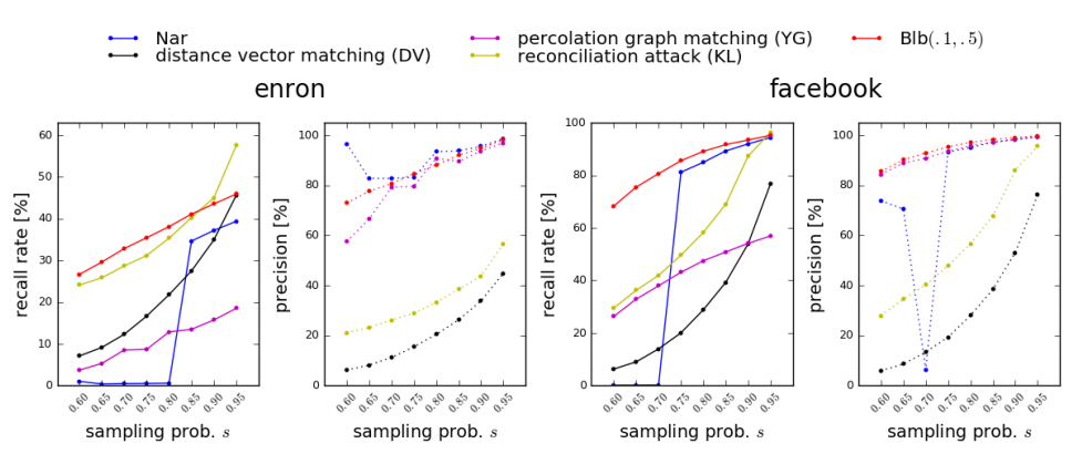Below you can see our results. In order to maintain comparability, we’ve selected graph data, anonymization techniques, de-anonymization attacks and all parameters just as they were put in the USENIX survey. Figure 1 shows results with naive anonymization. In almost all cases our attack managed to re-identify the largest set of users. When it did not, other attacks did a quite poor job (regarding precision): while they provided a larger set of correct re-identification mappings, these were garbled with a very large amount of erroneous mappings (such as 1:1 or worse).