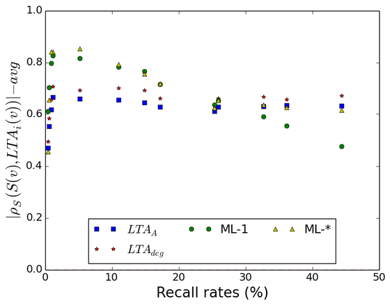 The following figure gives a comparison between results of the previous measures, and correlation for the data that machine learning predicted. (Due to memory problems I could not work on some datasets, but the figure still clearly tells you what we have here.) When the attacker was less successful (he could re-identify smaller fractions only), the machine learning based prediction had obviously better results. However, for the higher values of recall, the ML-* method produced reasonably well result, almost as good as the others. Thus we could say, that machine learning could do a better job than the manually crafted measures, even though it had access to less information compared to LTAA.