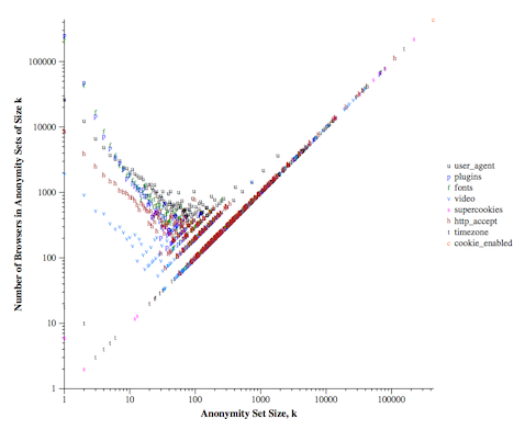 While I was working on a paper recently, I was asking myself the question how to visualize the uniqueness (or anonymity set sizes) in the data. The only visualization that I am still aware of is Fig. 3 in the Panopticlick experiment, which shows anonymity set sizes created by each value of each attribute. This is it: