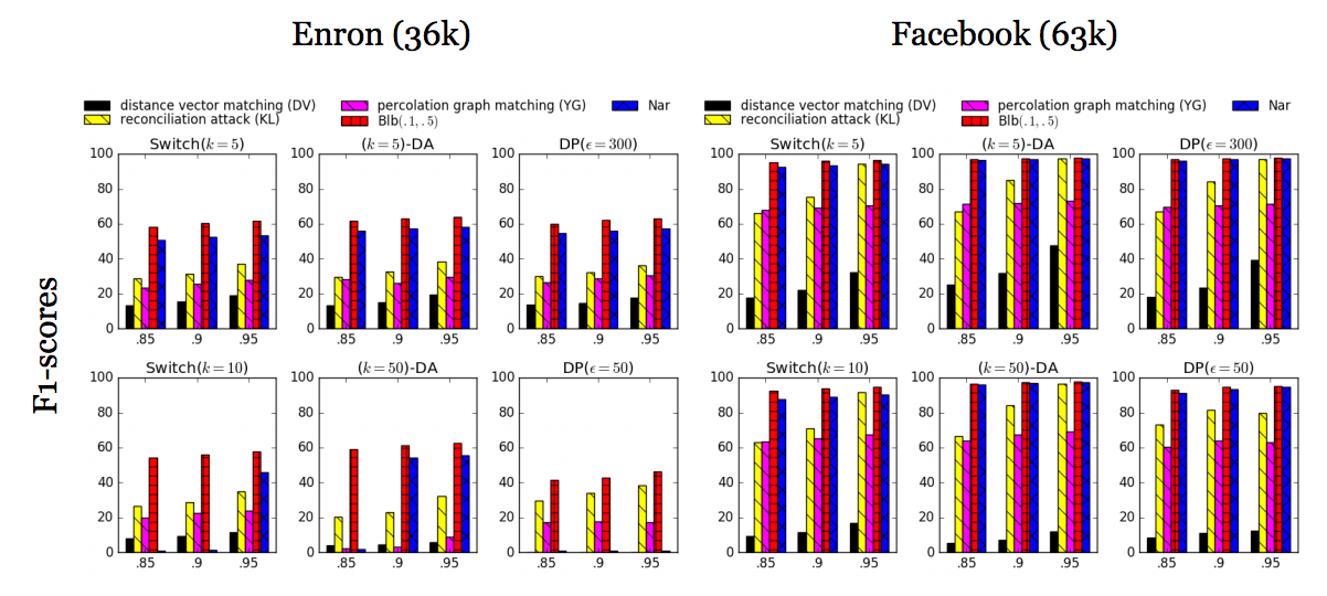 Below you can see our results. In order to maintain comparability, we’ve selected graph data, anonymization techniques, de-anonymization attacks and all parameters just as they were put in the USENIX survey. Figure 1 shows results with naive anonymization. In almost all cases our attack managed to re-identify the largest set of users. When it did not, other attacks did a quite poor job (regarding precision): while they provided a larger set of correct re-identification mappings, these were garbled with a very large amount of erroneous mappings (such as 1:1 or worse).