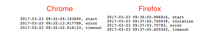 onerror JavaScript event is called (if there are any callback functions registered).report-uri.To the contrary, I found that these events are not encapsulated in an atomic event, significant delays can occur in between them. In our experiment, the timing is important, because we are measuring if a given CSP violation occurs in time or not. However, if it doesn’t happen, how can we know if we can move on? Well, the onerror could be such an indicator, or in the worst case, if a timeout happens.