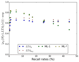 The following figure gives a comparison between results of the previous measures, and correlation for the data that machine learning predicted. (Due to memory problems I could not work on some datasets, but the figure still clearly tells you what we have here.) When the attacker was less successful (he could re-identify smaller fractions only), the machine learning based prediction had obviously better results. However, for the higher values of recall, the ML-* method produced reasonably well result, almost as good as the others. Thus we could say, that machine learning could do a better job than the manually crafted measures, even though it had access to less information compared to LTAA.